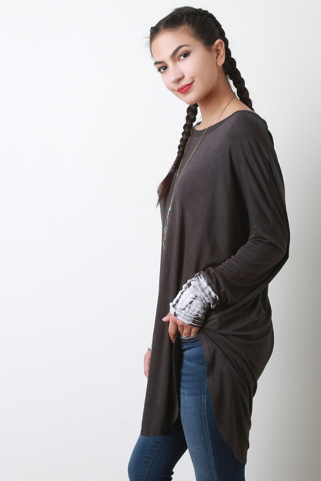 This jersey knit top features a round neckline, long sleeves with tie-dye hem, and rounded high low hemline finish. Accessories sold separately. Made in U.S.A. 94% Rayon, 6% Spandex.