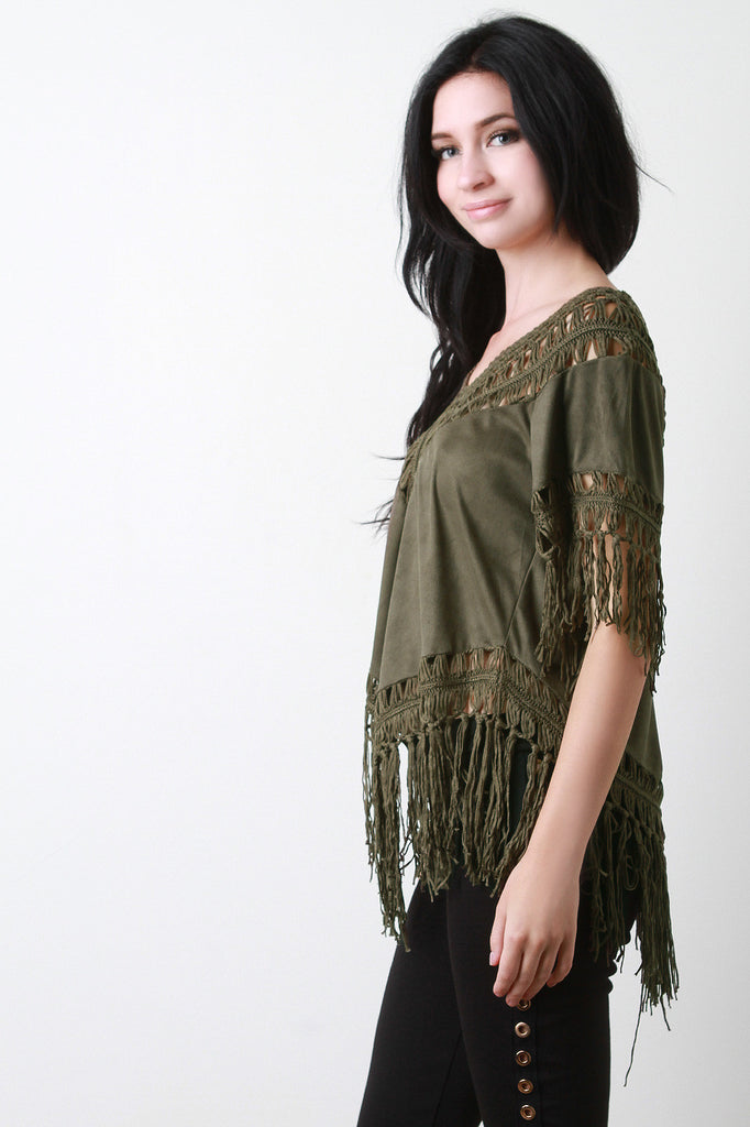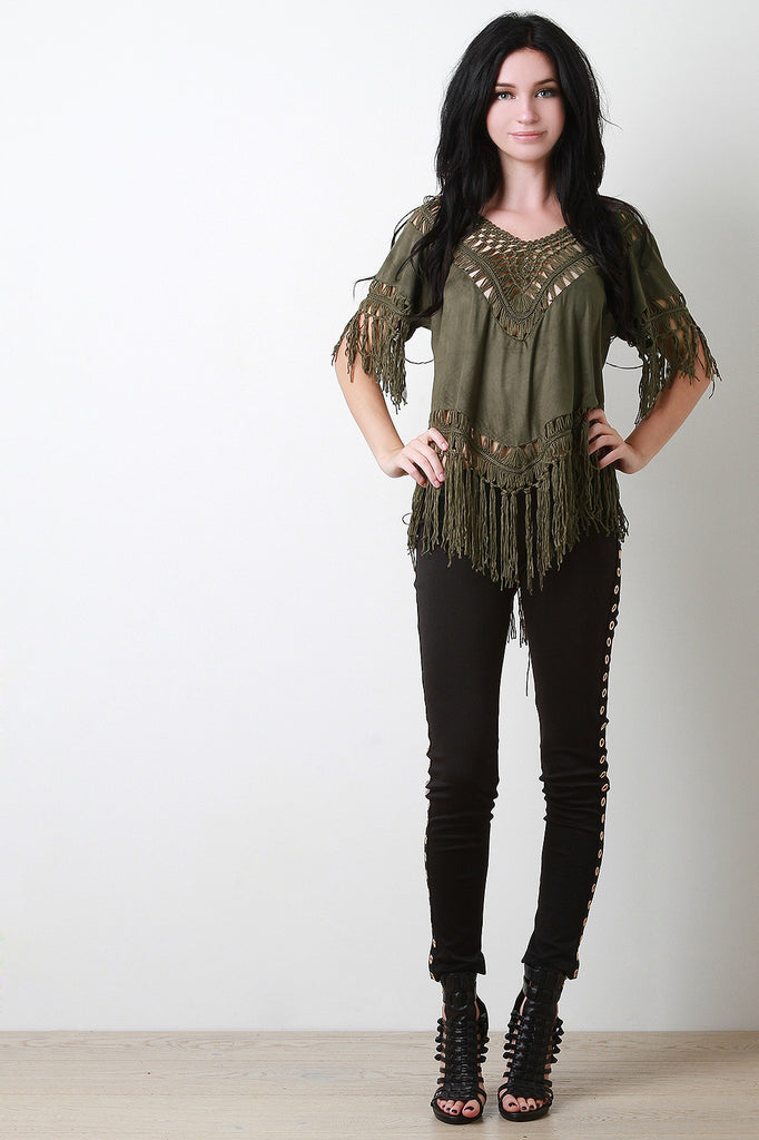 This top features vegan suede fabrication, macram� accent, v-neckline, short sleeves, and fringe hemline. Accessories sold separately. 100% Acrylic. Contrast: 100% Polyester.