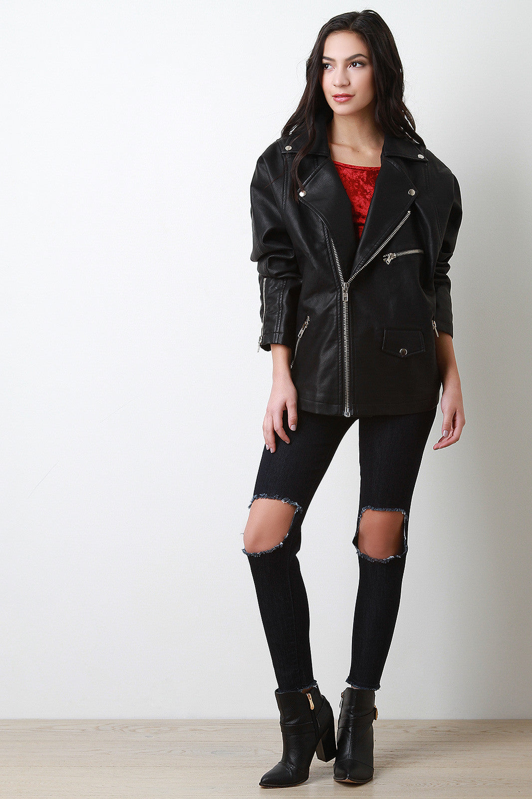 This jacket features textured faux leather, zip-up front, pointed collar and lapels, two zipper pockets, faux pocket with snap button closure, oversized design, and finished with lining. Accessories sold separately. Self: 60% Rayon, 40% PU. Lining: 100% Polyester.