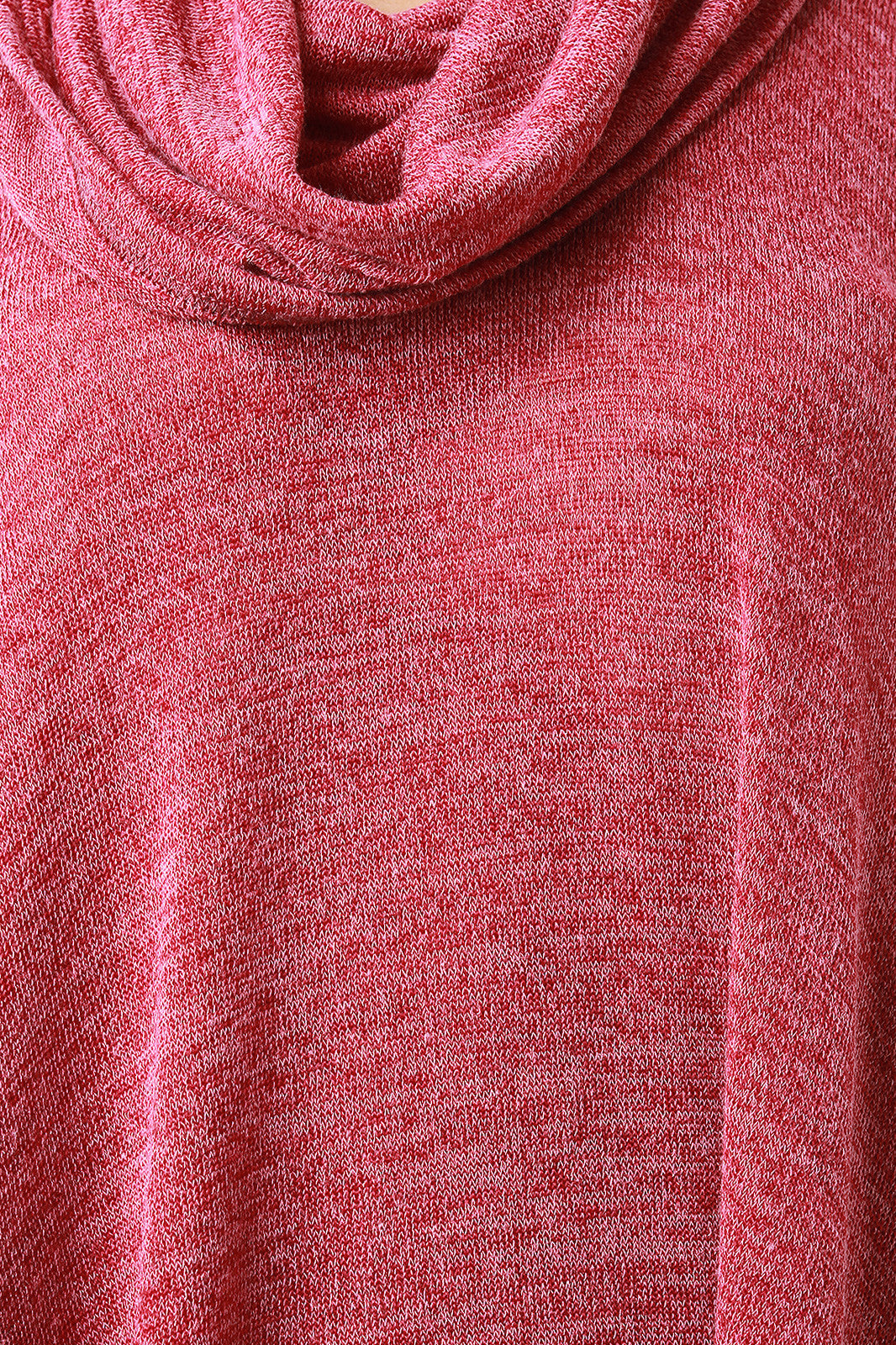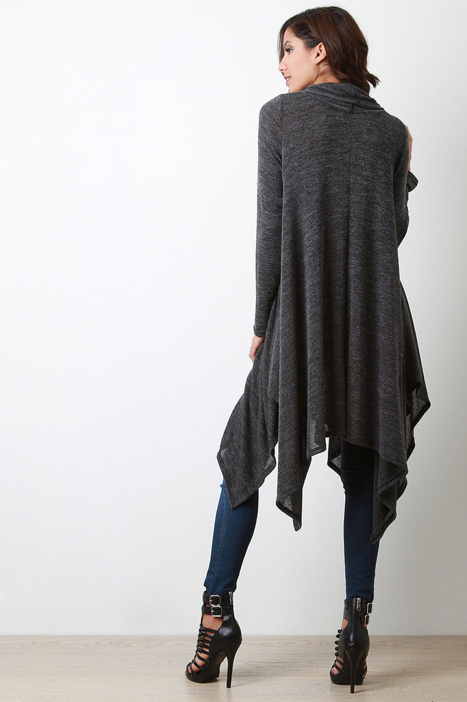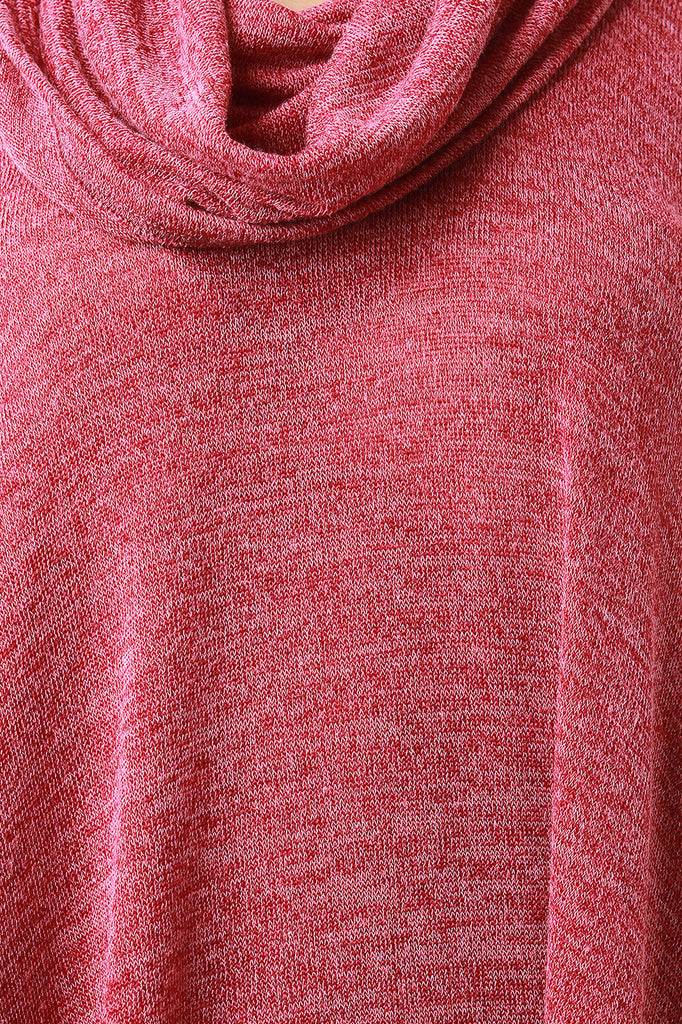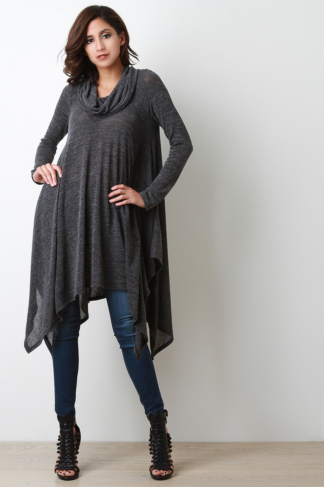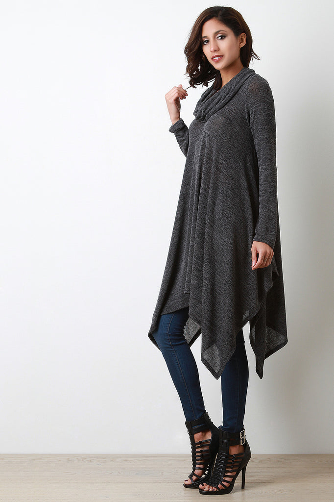 A relaxed fit maxi top featuring melange knit, a slouchy cowl neck, and long sleeves. Finished with a handkerchief hemline. Accessories sold separately. Made in U.S.A. 96% Polyester, 4% Spandex.