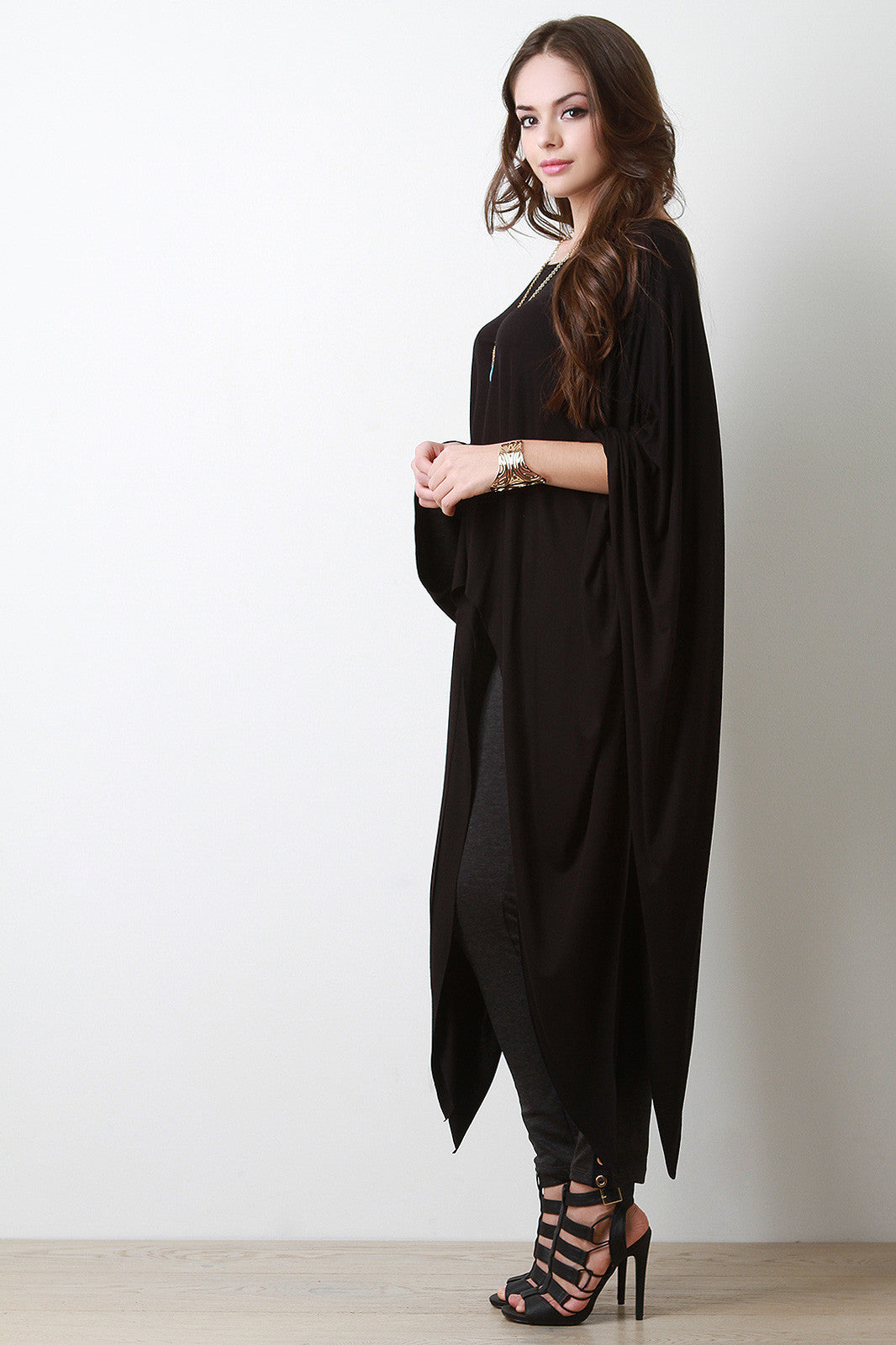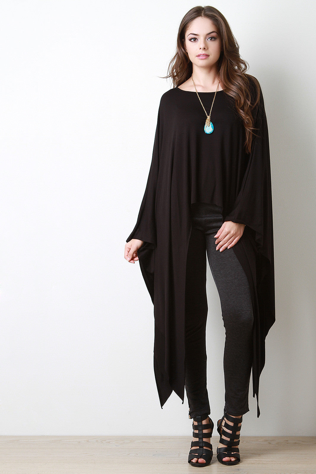 This poncho top features a soft jersey knit fabrication, round neckline, draped poncho sleeves, and raw sharkbite hemline. Accessories sold separately. Made in U.S.A. 96% Rayon, 4% Spandex.