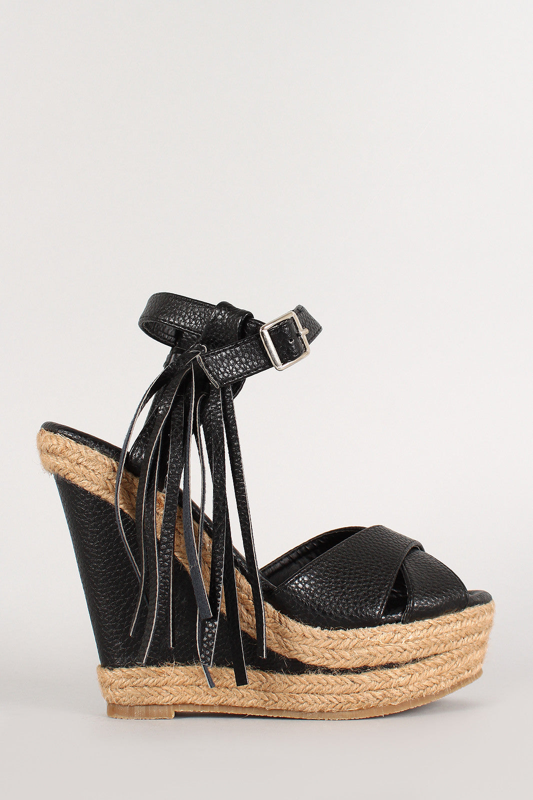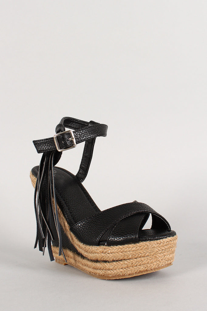 This platform fringe details on side, lightly padded insole, and adjustable ankle strap with buckle closure.