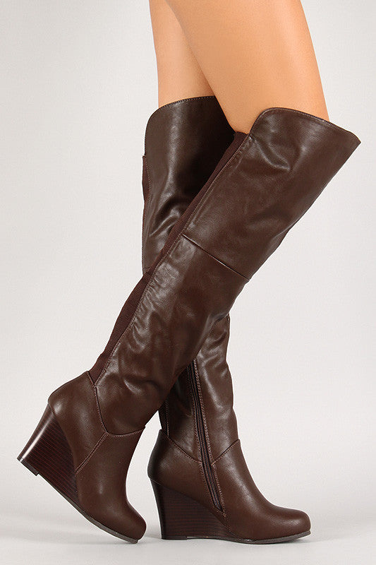 Featuring round toe, stretch fabric back panel, partial side zipper closure, stitching detail, wedge heel, and finished with lightly padded insole.