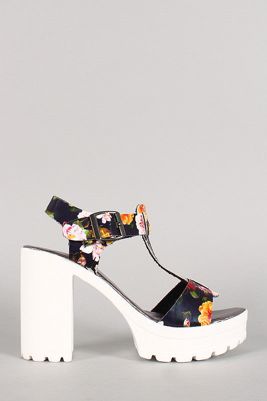 Featuring an open toe front, beautiful floral print leatherette upper, T-Strap design, chunky platform heel, lightly padded insole, and adjustable ankle strap with buckle closure.