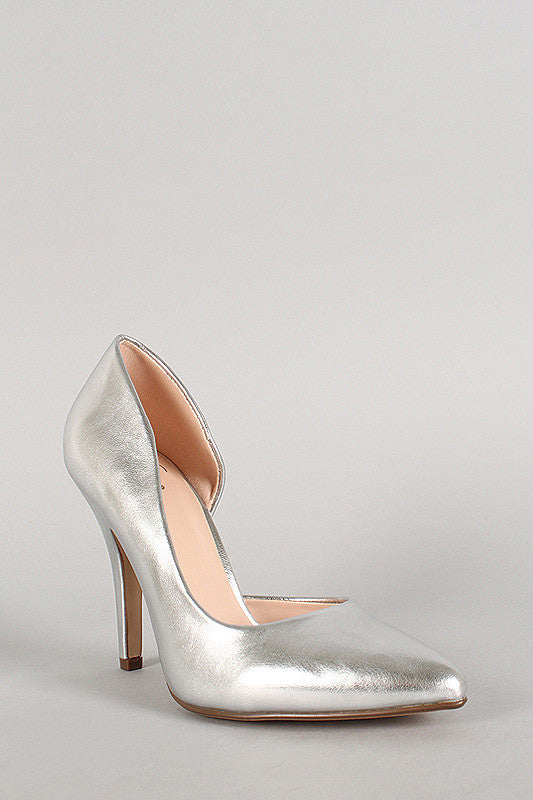 These gorgeous pumps feature a metallic vegan leather upper, pointy toe, Dorsay cutout along the instep, wrapped stiletto heel, lightly padded insole, and easy slide style.