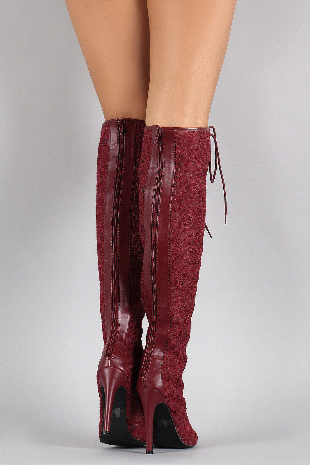 Qupid Floral Lace Stiletto Thigh High Lace Up Boot