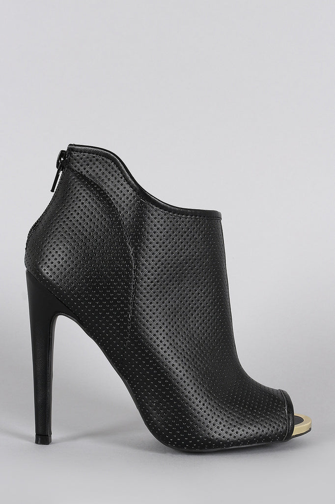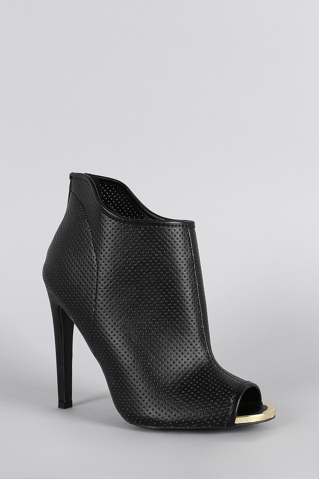 This ankle booties feature a peep toe silhouette with metallic trim, perforated detail throughout, asymmetrical collar, and wrapped stiletto heel. Finished with lightly cushioned insole and rear zipper closure for easy on/off.Material: Vegan Leather (man-made)Sole: Synthetic