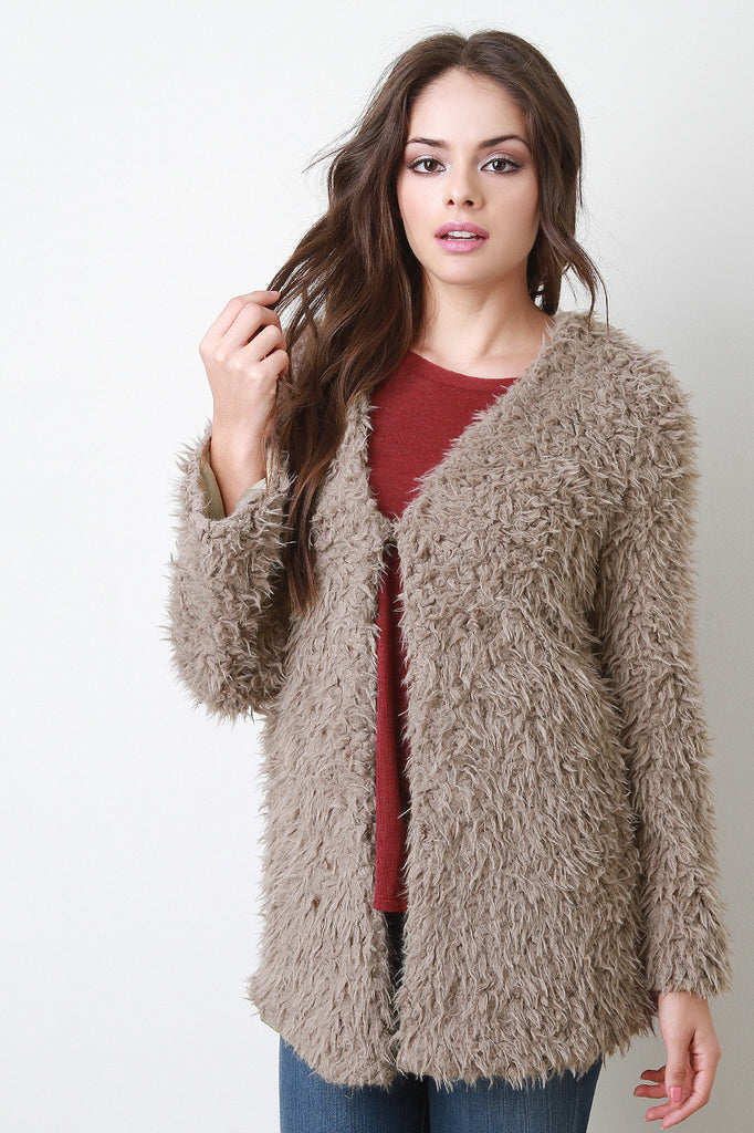 This fun and chic jacket features a soft faux fur texture knit, long sleeves, open front with a single hook-n-eye closure, and fully lined. Accessories sold separately. 100% Polyester.