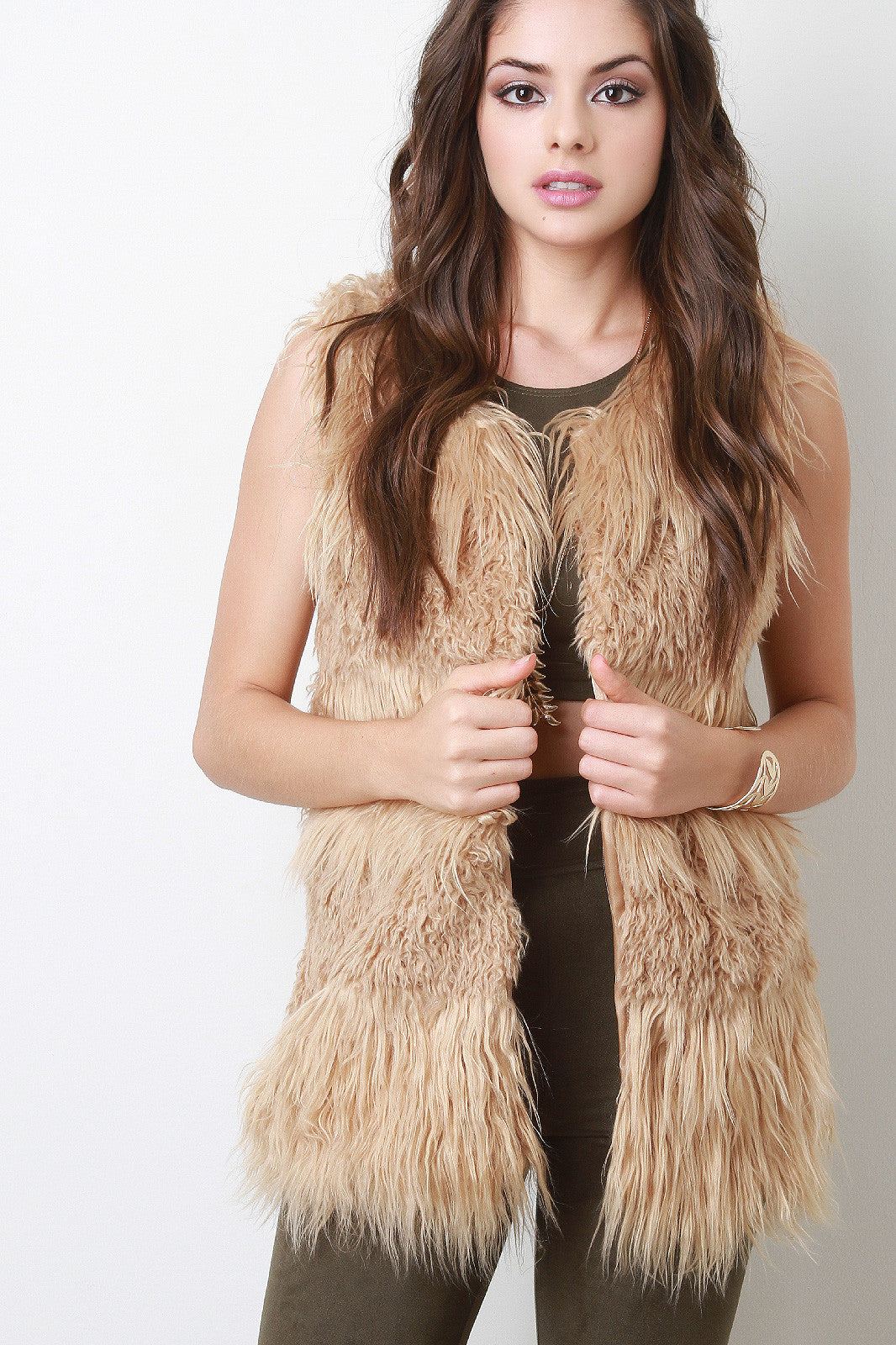 This sleeveless vest features a double texture faux fur vest, open front with two hook-n-eye closures, side pockets, and fully lined. Accessories sold separately. 80% Acrylic, 20% Polyester. Lining: 100% Polyester.