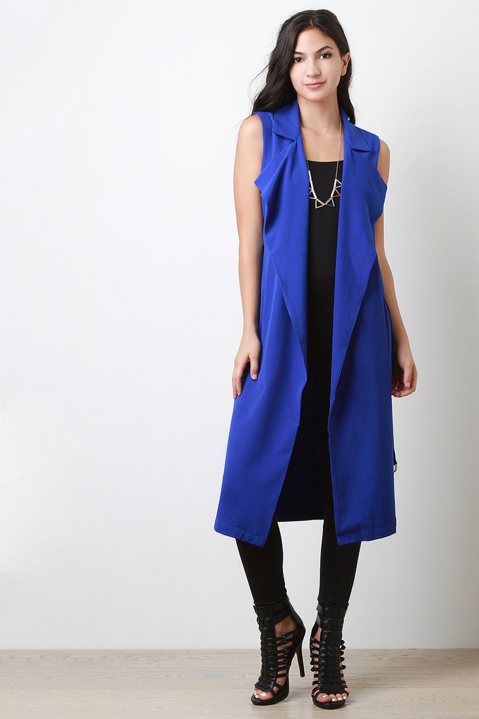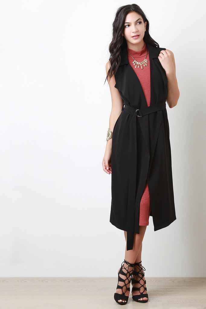 This longline vest features a trench coat inspired design, sleeveless, open front, wide flap color neckline, side belt loops, d-ring belt sash, and side pockets. Accessories sold separately. 97% Polyester, 3% Spandex.