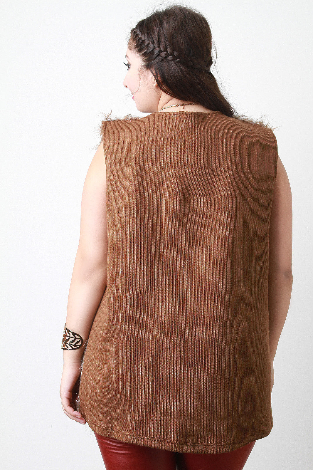 This plus size sleeveless vest features a collarless construction, multicolor faux fur front, solid ridged knit at back, open front design, and partially lined. Accessories sold separately. 100% Polyester.