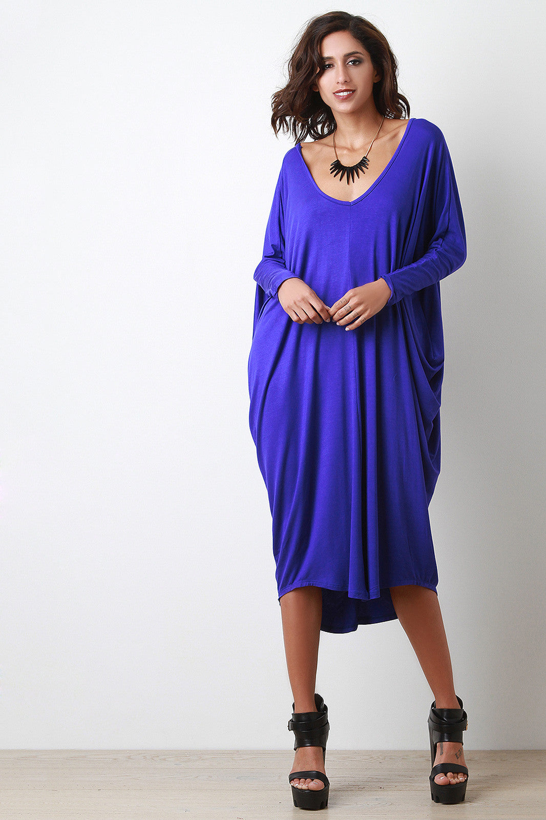 This loose-fit midi dress features solid color jersey knit, a plunging  v-neckline, and long dolman sleeves. Finished with a large keyhole back. Accessories sold separately. Made in U.S.A. 96% Rayon, 4% Spandex.