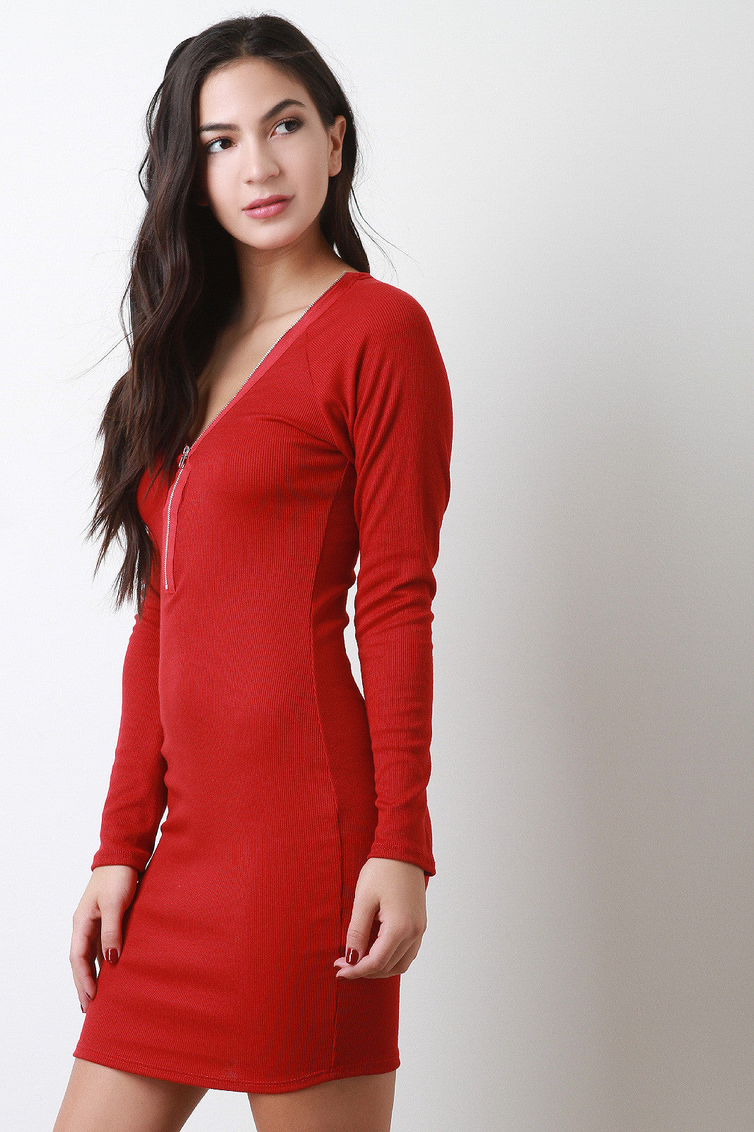 A fitted mini dress featuring a ribbed knit fabrication, a v-neck with zipper trim, and long sleeves. Accessories sold separately. Made in U.S.A. 62% Polyester, 34% Rayon, 4% Spandex.