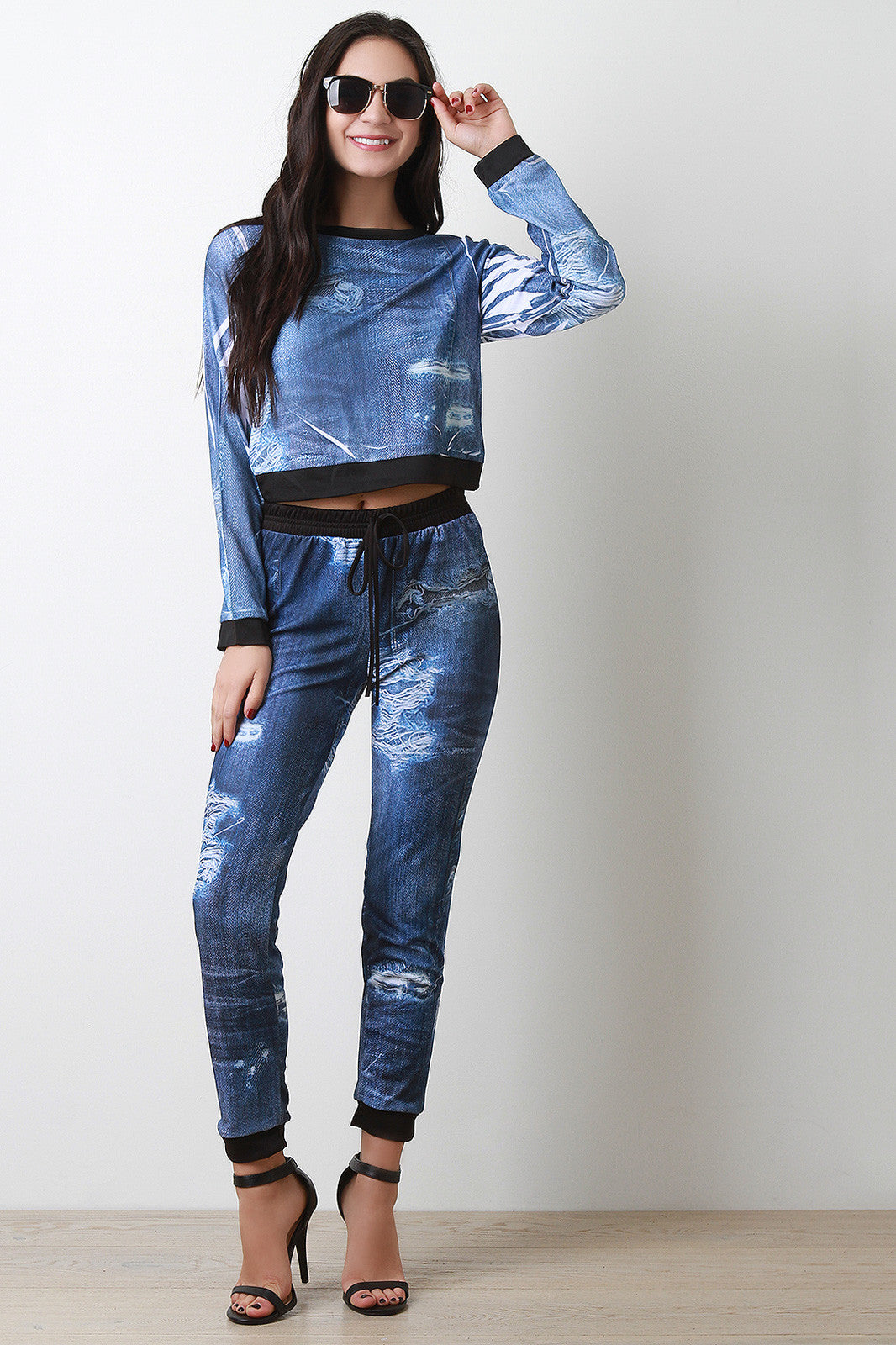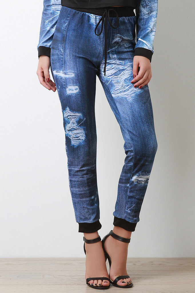 These denim print on smooth fabric, elasticized waistband with faux drawstring bow accent, and solid color hems. Accessories sold separately. Made in U.S.A. 95% Polyester, 5% Spandex.