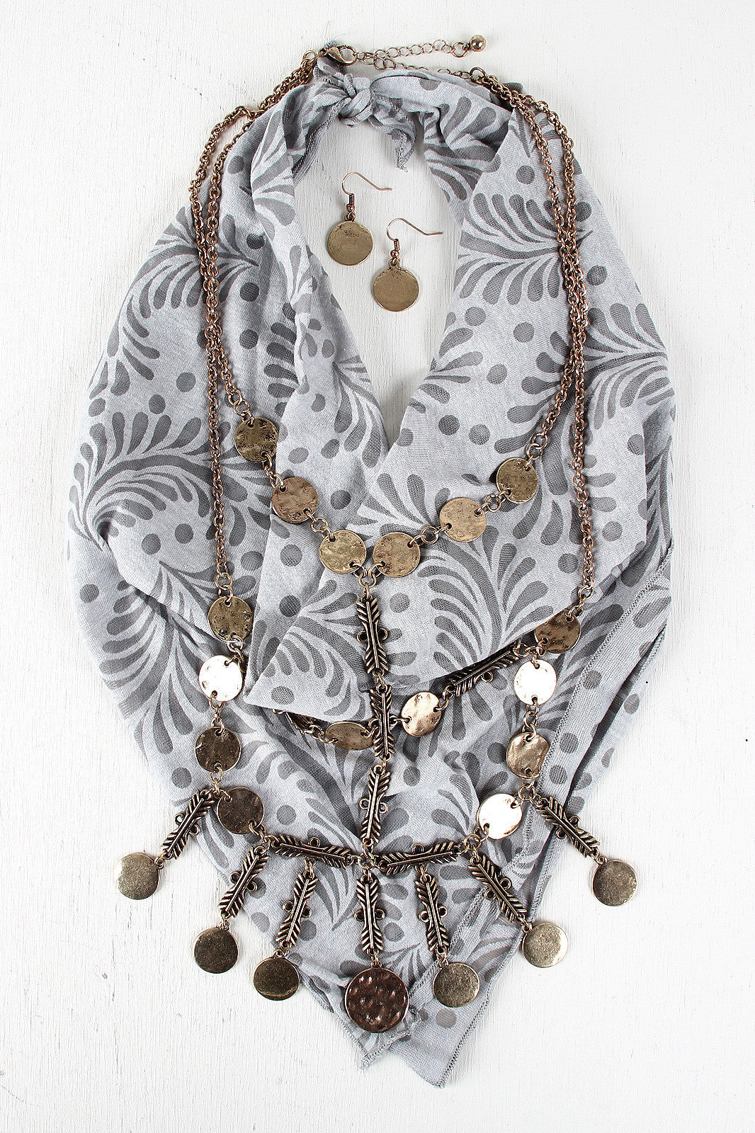 This layered cable chain necklace features hammered disk pendants, double-sided fletching pieces, and an adjustable lobster hook closure. Necklace includes matching earrings and a semi-sheer frond pattern bandana. Lead compliant.