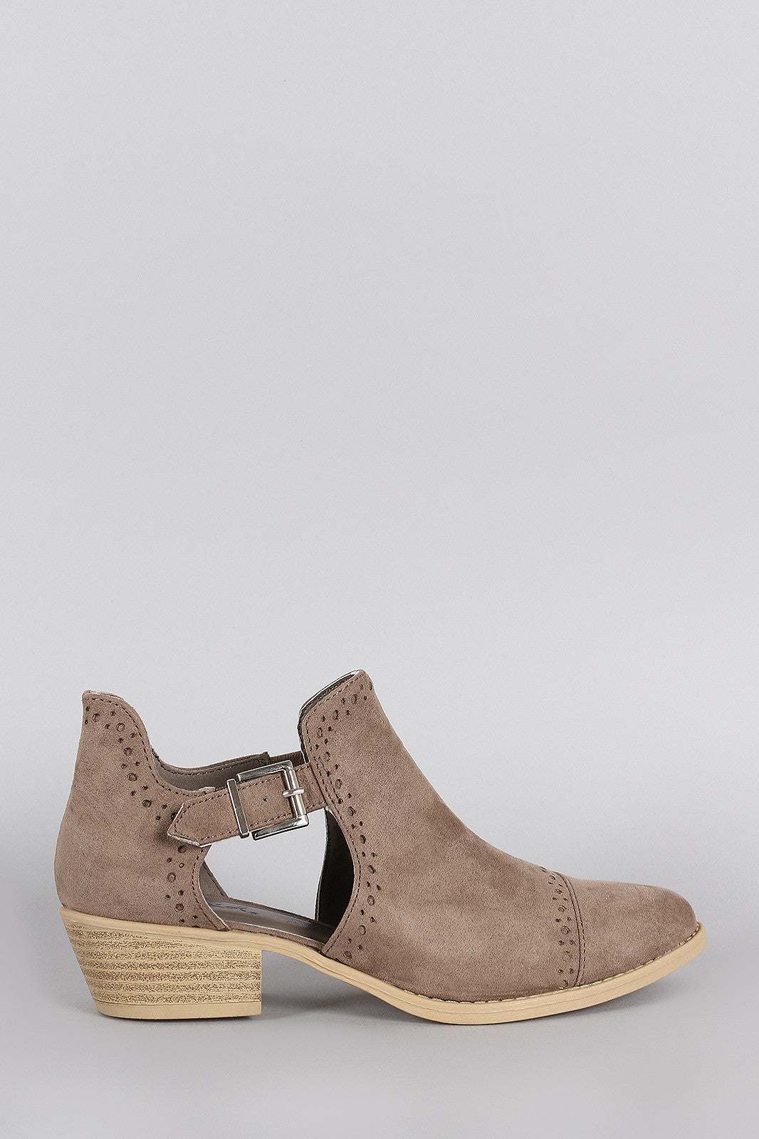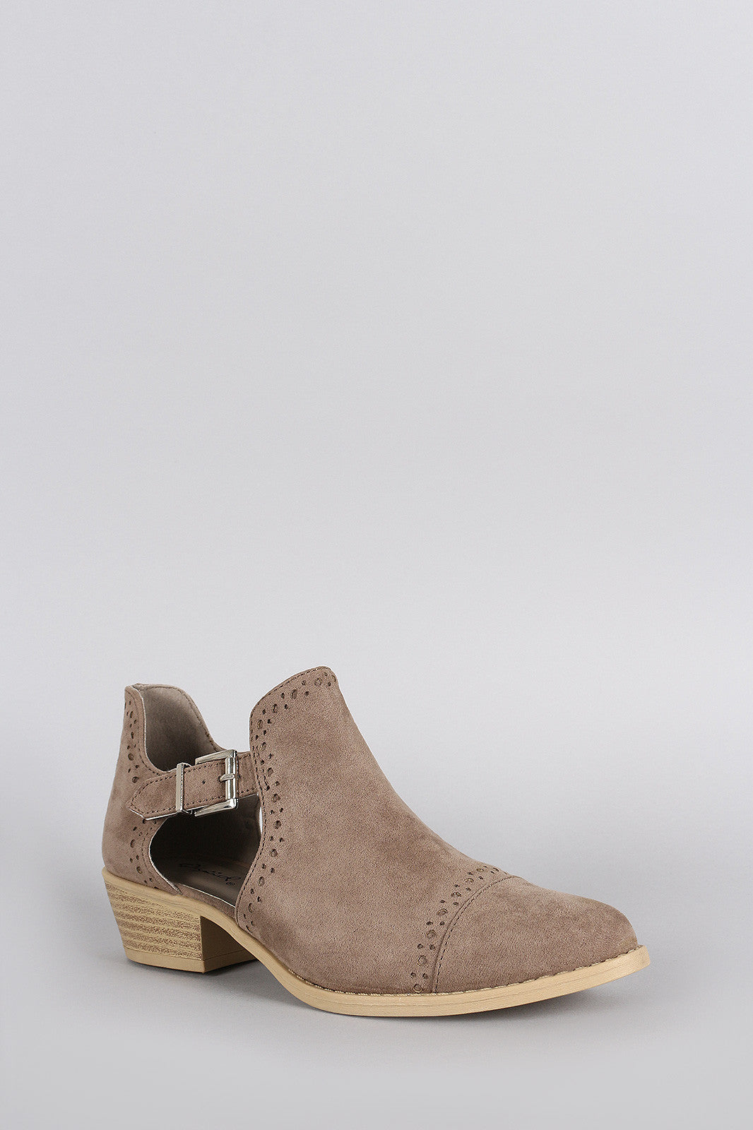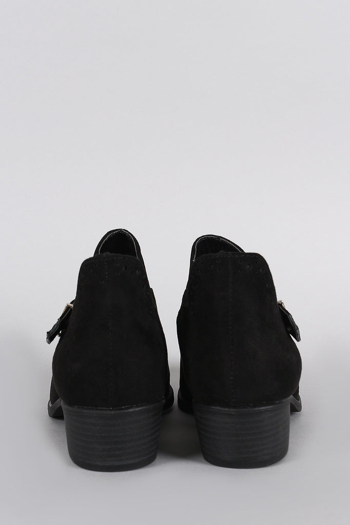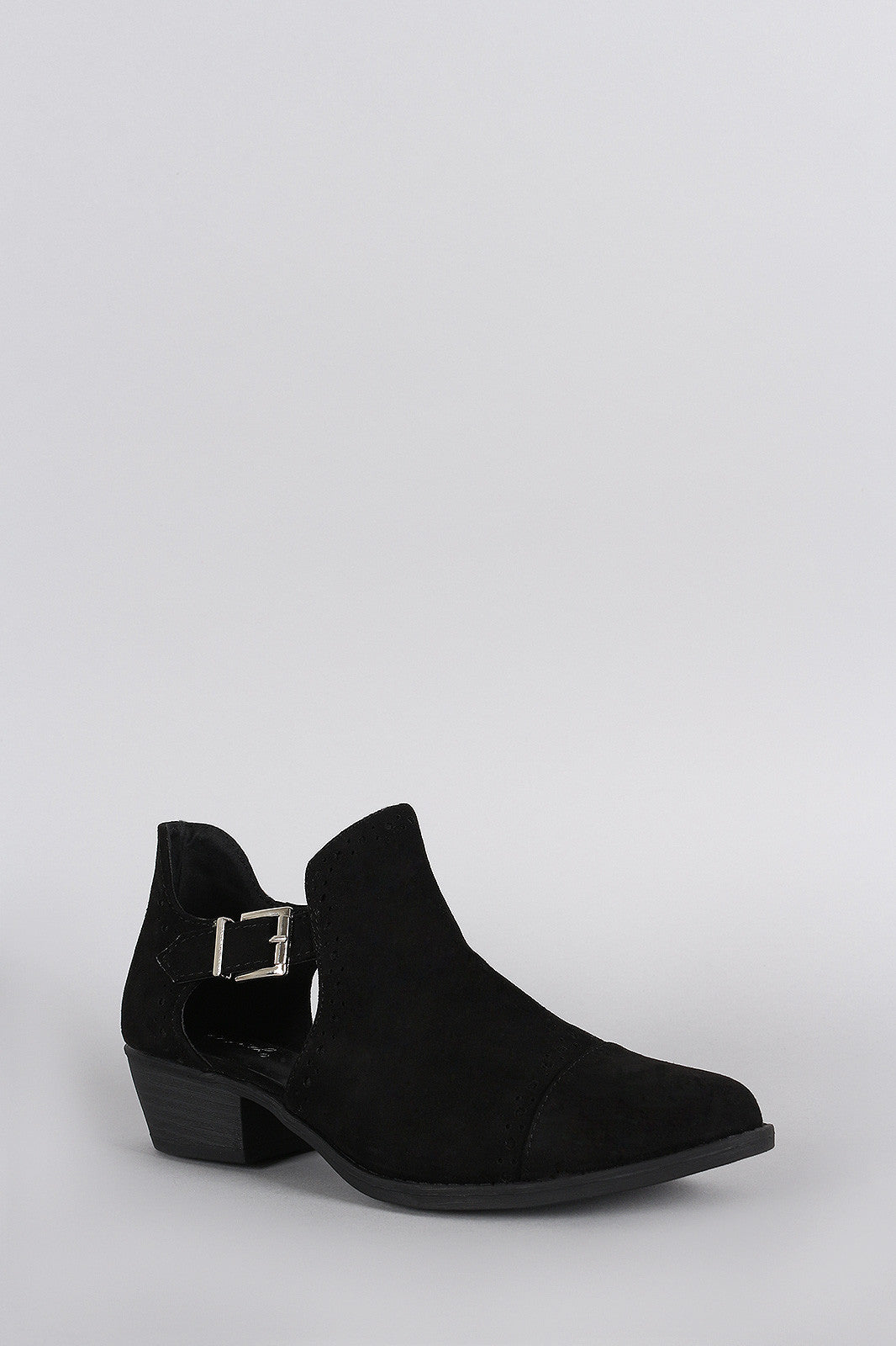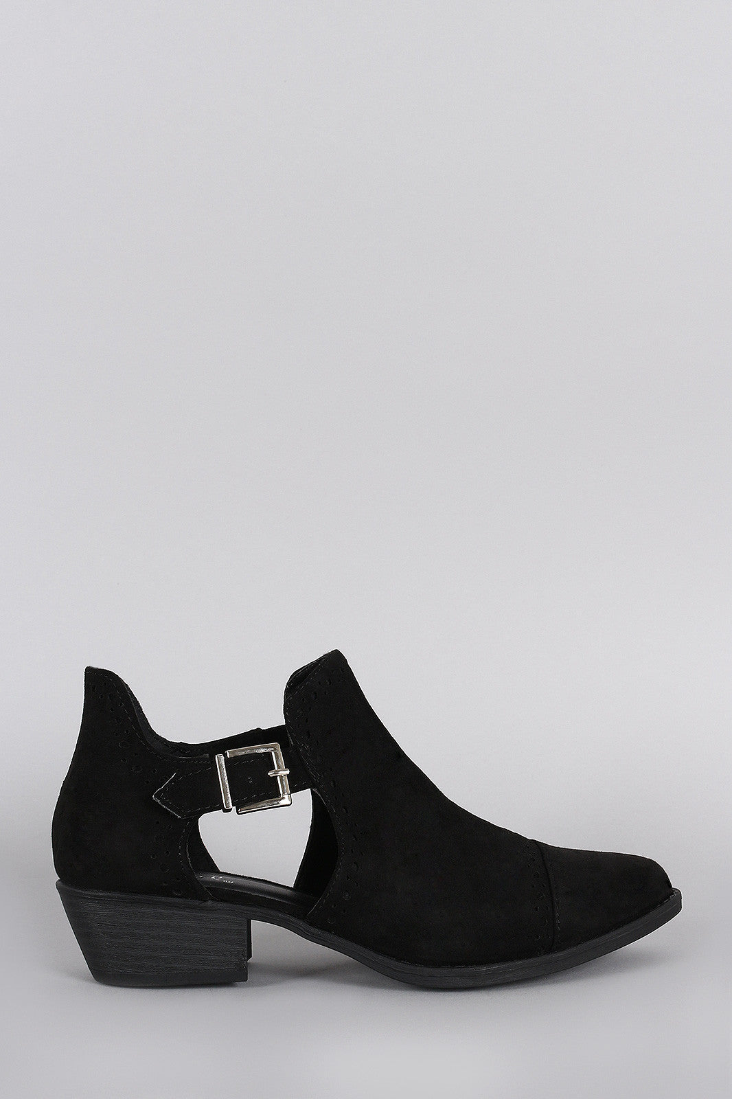 These edgy ankle boots feature a smooth vegan suede upper with perforated detail, narrow toe, side cutout design with buckled strap accents, low stacked heel, and lightly padded insole for comfort.Material: Vegan Suede (man-made)Sole: Synthetic
