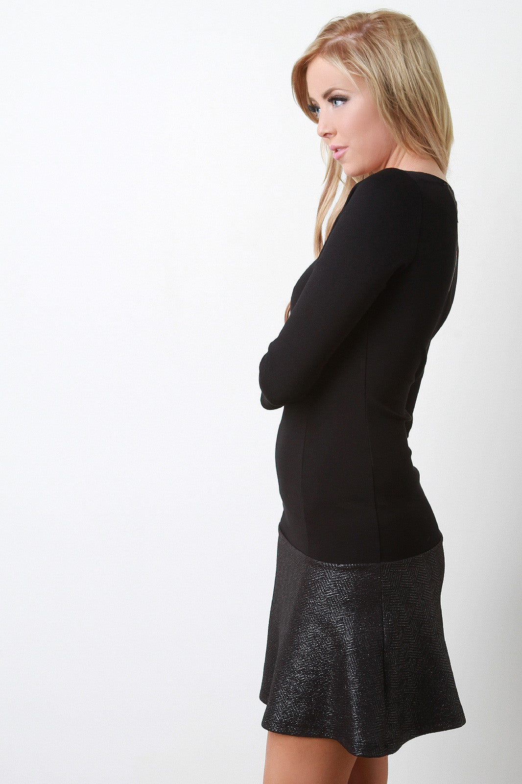 This combo dress features a round neckline, quarter-length sleeves, zipper back, drop waist seam, and a contrasting sparkly texture flare skirt half. Made in U.S.A. 67% Nylon, 28% Viscose, 5% Spandex. Contrast: 95% Nylon, 5% Spandex.