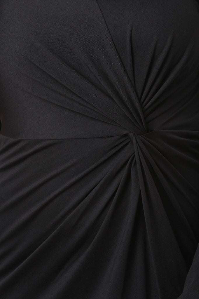 A floor-length long sleeves . The bodice features an asymmetrical seam that converges at an off-center knot and high front slit. Finished with a concealed back zipper closure. Accessories sold separately. 90% 100D Low Elastic, 10% 40D Spandex.