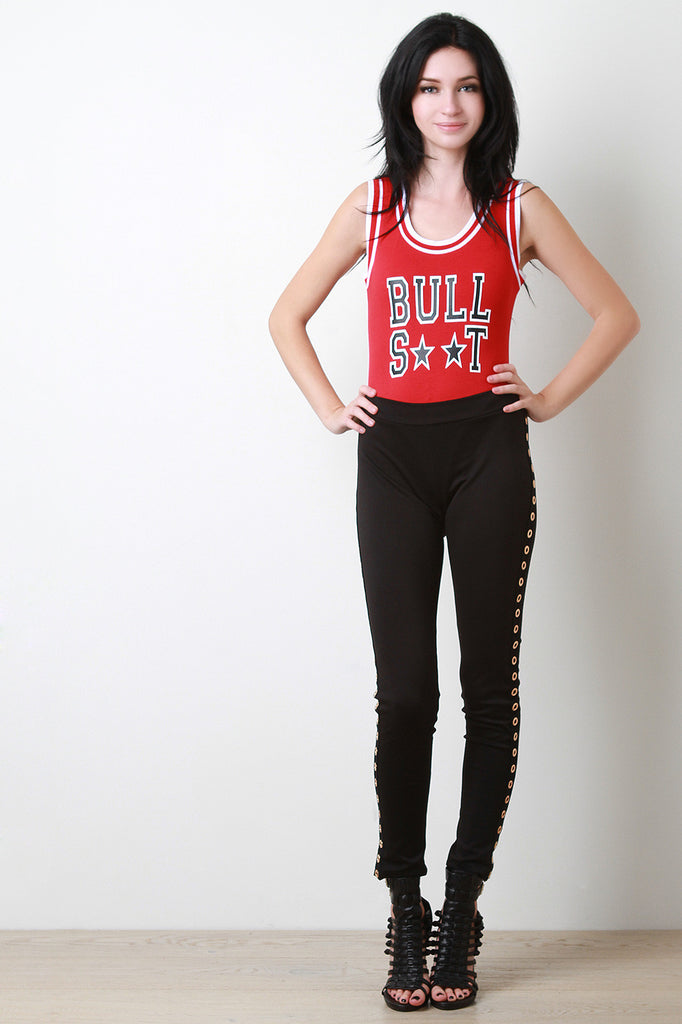 This sporty bodysuit features a round neckline, sleeveless design, high brief cut, triple snap button closure at crotch, contrasting trimming, and "Bull S**T" screen print at front. Accessories sold separately. 55% Cotton, 40% Polyester, 5% Spandex.